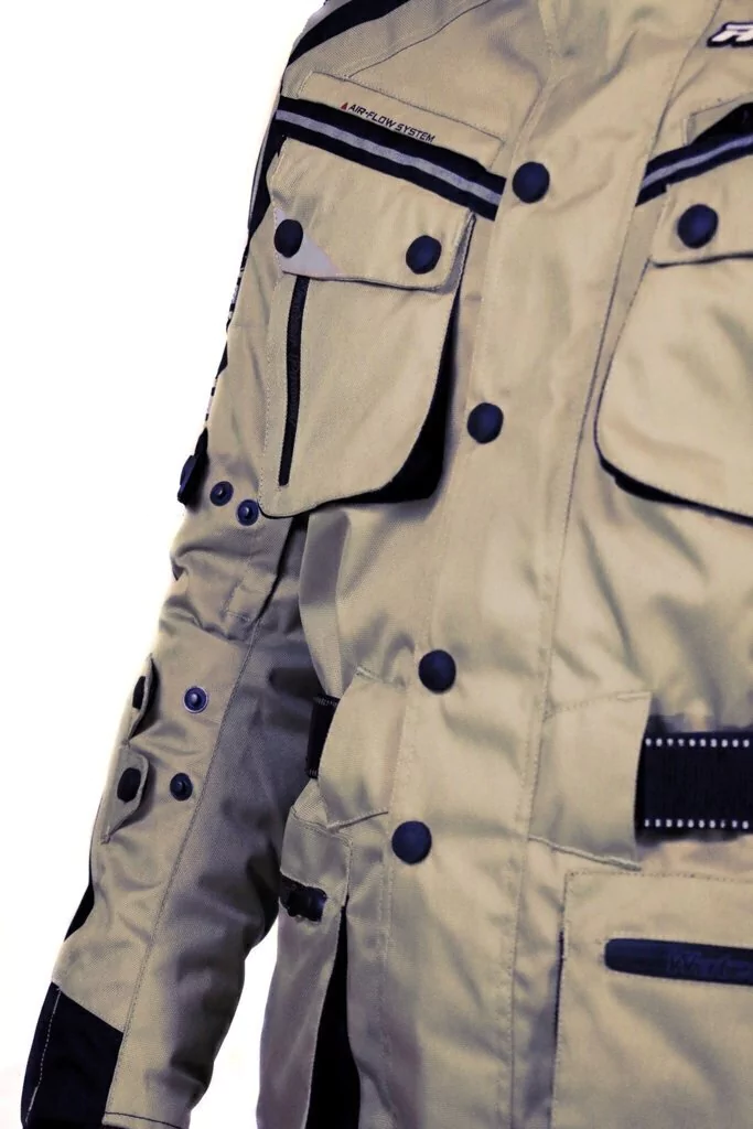 La campera cuenta con ajuste en bíceps, antebrazo y cintura, múltiples bolsillos delanteros y uno trasero, cuello interno con neoprene y elastizado ergonómico en codos. Las protecciones que equipa esta campera, fabricadas en materiales con memoria elástica y viscoelástica, están homologadas por CE grado 1 y 2, combinan gran movilidad y resistencia. Las mismas están diseñadas para reaccionar de forma inteligente ante un eventual golpe o caída.